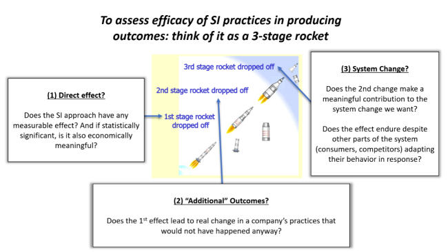 While the details differ with different SI practices, the high-level principle is often the same: the SI intervention is meant to have some direct effect; that triggers another indirect effect; and that in turn enables some kind of ultimate, systemic effect – something that corrects for externalities or contributes to solving problems.
