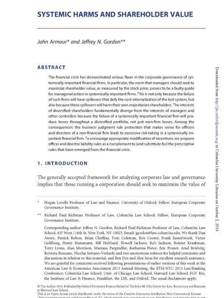 The financial crisis has demonstrated serious flaws in the corporate governance of systemically important financial firms. In particular, the Shareholder Value norm, which has guided corporate governance reform for a generation, proves to be a faulty guide for managerial action in systemically important firms. This is not only because the failure of such firms will have spillovers that defy the cost-internalization of the tort system but also because these spillovers will harm their own majoritarian shareholders. The interests of diversified shareholders fundamentally diverge from the interests of managers and other controllers because the failure of a systemically important financial firm will produce losses throughout a diversified portfolio, not just own-firm losses. Among the consequences: the business judgment rule protection that makes sense for officers and directors of a non-financial firm leads to excessive risk-taking in a systemically important financial firm. To encourage appropriate modification of the Shareholder Value norm, we propose officer and director liability rules as a complement (and substitute) to the prescriptive rules that have emerged from the financial crisis.