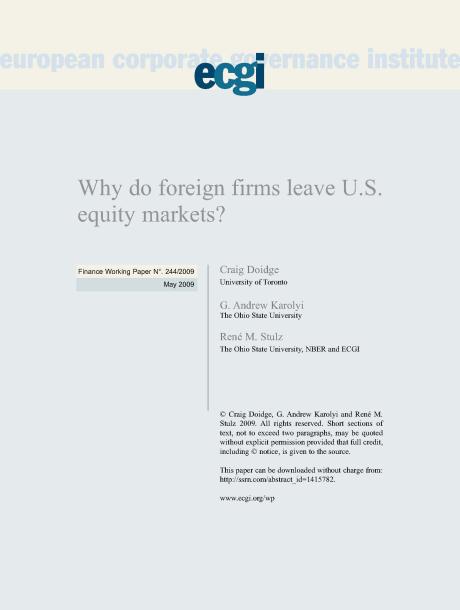 Finance Series Why do foreign firms leave U.S. equity markets? Working Paper Author/Authors Craig Doidge Andrew Karolyi René Stulz The Ohio State University Series number: 244/2009 Date published: 01 May 2009 Quick links Access Paper on SSRN Categories Markets Competition Theory Keywords Corporate governance, SOX, deregistration, Exchange Act Rule, bonding theory, loss of competitiveness theory